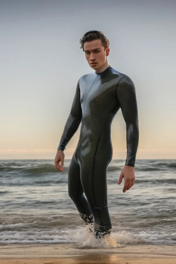 Seamless Neck-Entry: To maintain the uninterrupted "liquid" look of the emerald latex, this suit features a zipperless neck-entry system. The reinforced collar stretches to allow entry, then snaps back to a snug, high-neck fit that provides a clean, hardware-free profile.