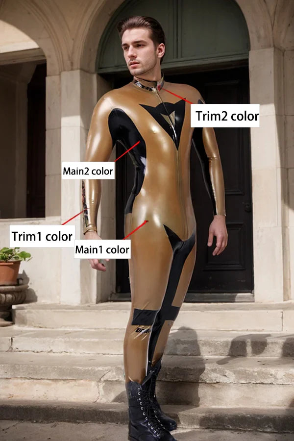 Expertly crafted from 0.40mm high-gloss natural latex, featuring a luxurious contrast of rich metallic gold and deep black, punctuated by high-visibility red racing accents;