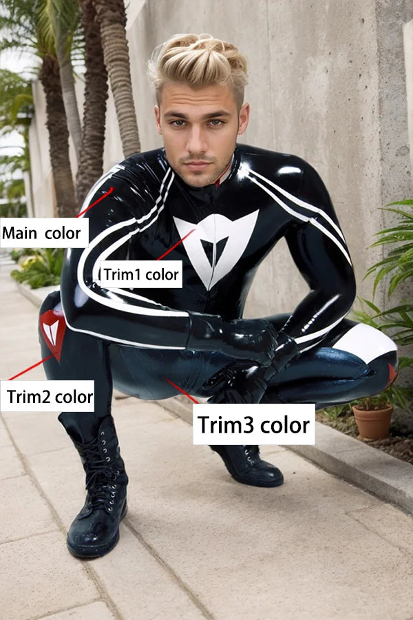 Take command of the track with the MotoGP Edition 20 latex jumpsuit, a high-performance design inspired by professional motorcycle racing leathers;