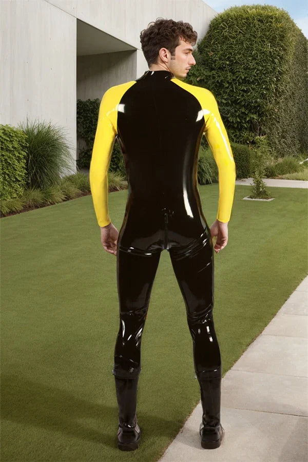 Liquid-Mirror Luster: Crafted from 100% premium natural latex, the suit offers a high-definition "wet-look" finish. The interaction between the light-absorbing black and the light-reflecting yellow creates sharp reflections that highlight every contour of the physique.