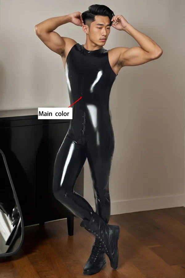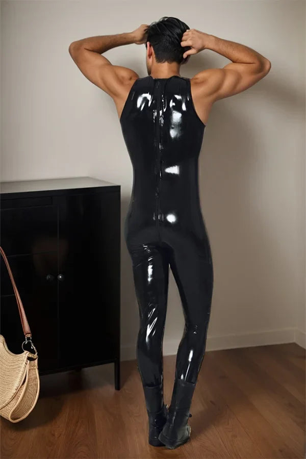 The fabric material is: 100% premium natural latex in a deep, uniform obsidian black, delivering a liquid-like mirror shine that accentuates every muscle contour and physical detail;