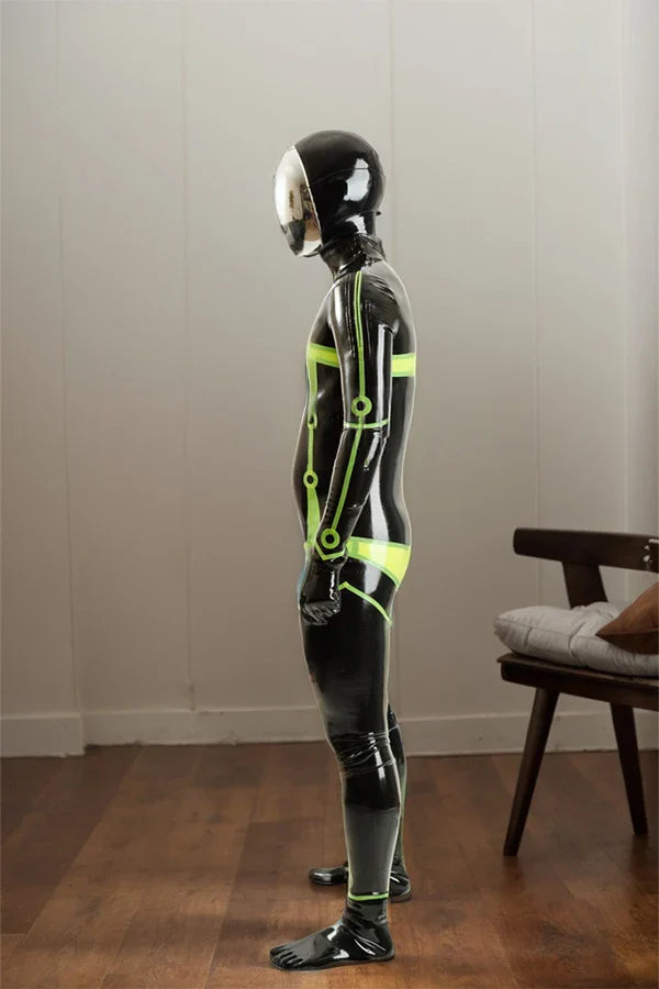The fabric material is: 100% premium 0.40mm high-gloss natural latex, featuring a mirror-finish black base energized by "neon" grass green circuit lines that reflect environmental light like digital energy;