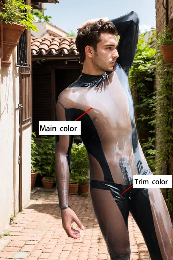 Dual-Grade Material Engineering: Crafted from two distinct grades of high-gloss natural latex, this suit features a tantalizing translucent smoky black body paired with striking opaque black paneling for a high-contrast, provocative look;