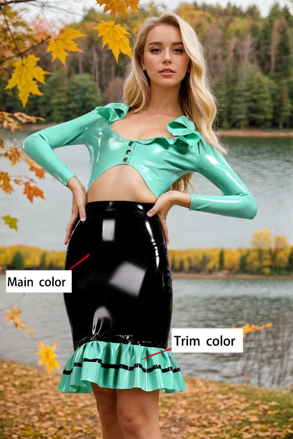 Graphic "Sailor" Stripe Hem: The emerald green ruffle is meticulously detailed with horizontal black latex bands. This nautical-inspired "racing stripe" design adds a rhythmic, athletic detail to the feminine frill, reinforcing the "Seaside" theme.