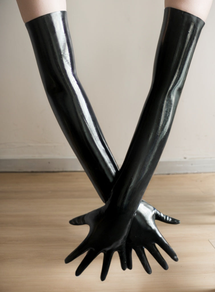 High-Gloss Finish: Made from black latex, the gloves' surface has a highly smooth and reflective quality that brightly reflects light, giving them a brilliant, polished look. This luminous quality is one of their most eye-catching features.