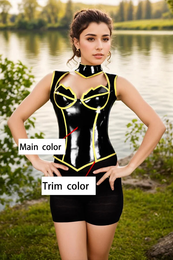 The "Fangora" Concept Meticulously crafted from premium 1.0 mm natural latex, the "Fangora" boasts a luxurious weight and a mirror-like shine. The rich black base serves as the perfect canvas for the kinetic yellow trim, which outlines the garment¡¯s structure with graphic precision. This unique styling accentuates the body¡¯s natural curves while adding a futuristic, comic-book-inspired flair. The elegance of the halter neck combined with the daring frontal cut-out ensures a look that is both avant-garde and timelessly provocative.
