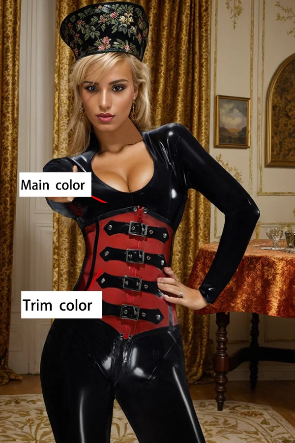 The "Buckle Baby Burn" Concept This corset is designed to be a "scorching" visual statement. The high-gloss 1.0mm latex reflects light brilliantly, emphasizing the contrast between the fiery red panels and the dark, structural black accents. The combination of the front zipper, heavy-duty buckles, and rear lacing creates a look that is both functional and unapologetically avant-garde.