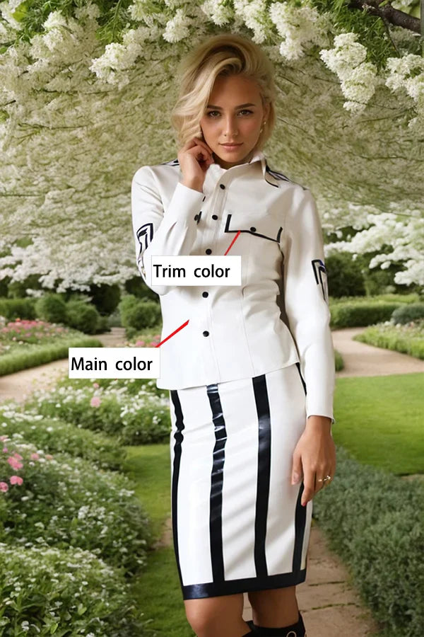 Contrast Accents: The black trim on the collar, cuffs, and pockets creates a sharp, graphic contrast against the pristine white latex.