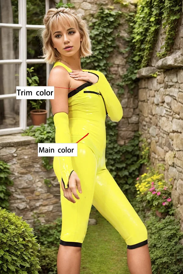 The Liquid Neon Luster Crafted from premium 0.40 mm natural latex, the suit is polished to a mirror-like finish. The surface captures light to create intense highlights, giving the yellow pigment a multidimensional, "wet-look" glow that remains consistent from every angle.