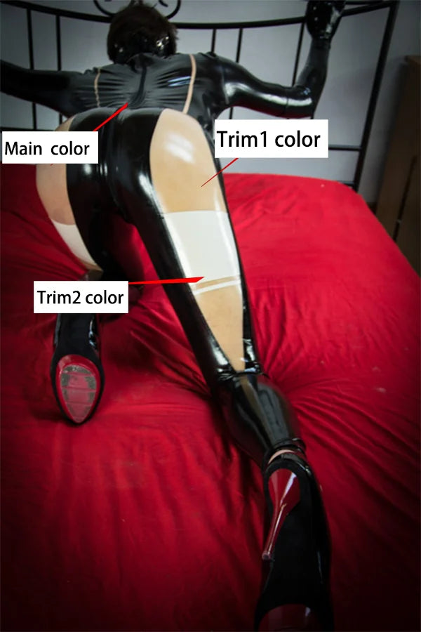 Architectural Rear Paneling: While the front maintains a classic, sleek black profile, the back of the suit is a triumph of geometric design. Large panels of Translucent Nude latex are strategically placed across the glutes and upper thighs, creating a daring "peek-a-boo" effect that mimics bare skin.