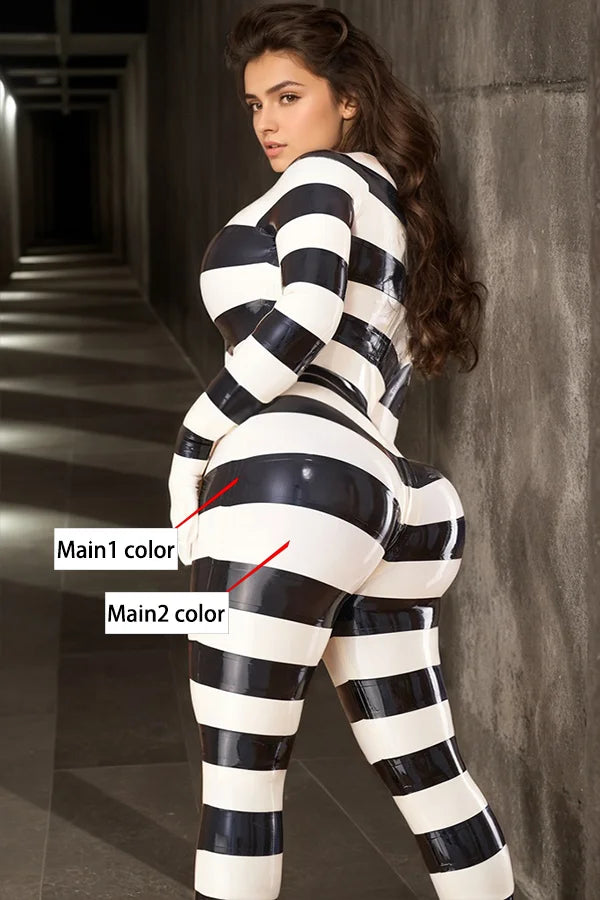 Material & Gloss: Make a bold, dynamic statement in the "Jailbreak" catsuit. Crafted from premium 0.40 mm natural latex, this piece features the iconic horizontal stripe motif rendered in a high-impact monochromatic palette. The smooth, reflective surface creates a vibrant "wet-look" shine that intensifies the color contrast and celebrates the wearer's curves with a polished, liquid-like finish.