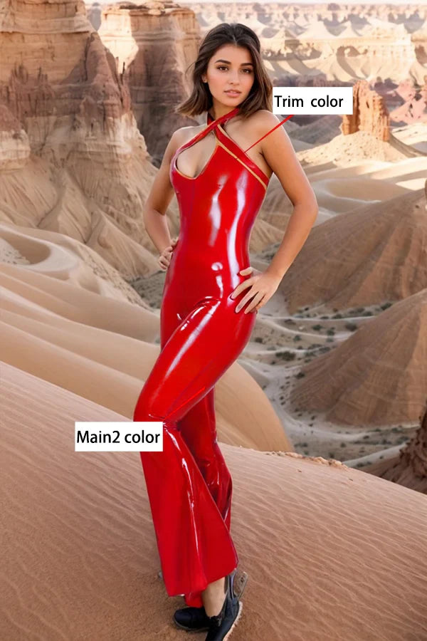 One-piece sleeveless flare-leg latex jumpsuit.