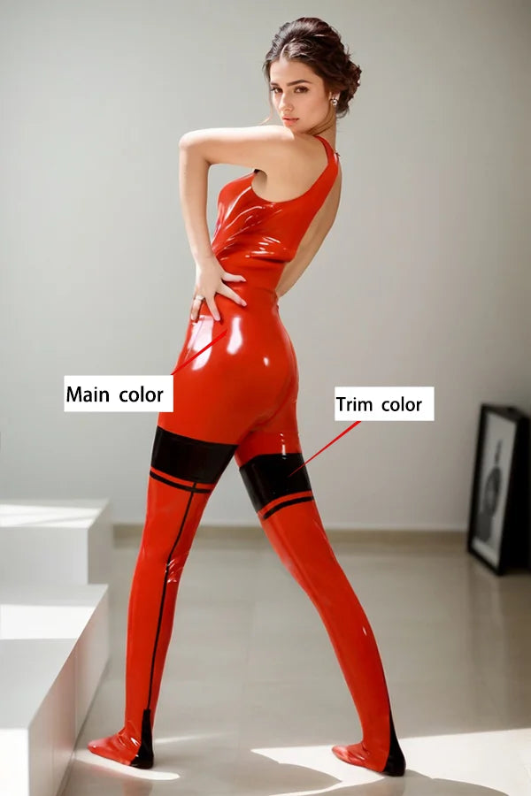 Material & Gloss: Command attention in the "Spellbound" catsuit, a masterpiece of bold and alluring design. Crafted from premium 0.40 mm natural latex, the vibrant red fabric delivers a mesmerizing "wet-look" shine that captures and reflects light beautifully. The inclusion of high-contrast black trimming adds a touch of dramatic elegance and visual depth to this high-impact piece.