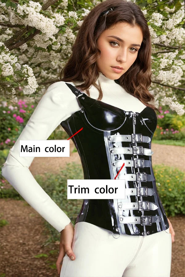 The "Serpentine" Concept Meticulously crafted from premium high-gloss black latex, the "Serpentine" corset is designed for those who command a room. The defining characteristic is the series of grey straps that wind across the torso like a digital serpent. These straps are not merely decorative; they feature silver buckles and rivets that give the piece a rugged, sophisticated texture. The contrast between the slick black base and the matte-metallic accents creates a futuristic "armor" aesthetic that is both functional and intimidating.
