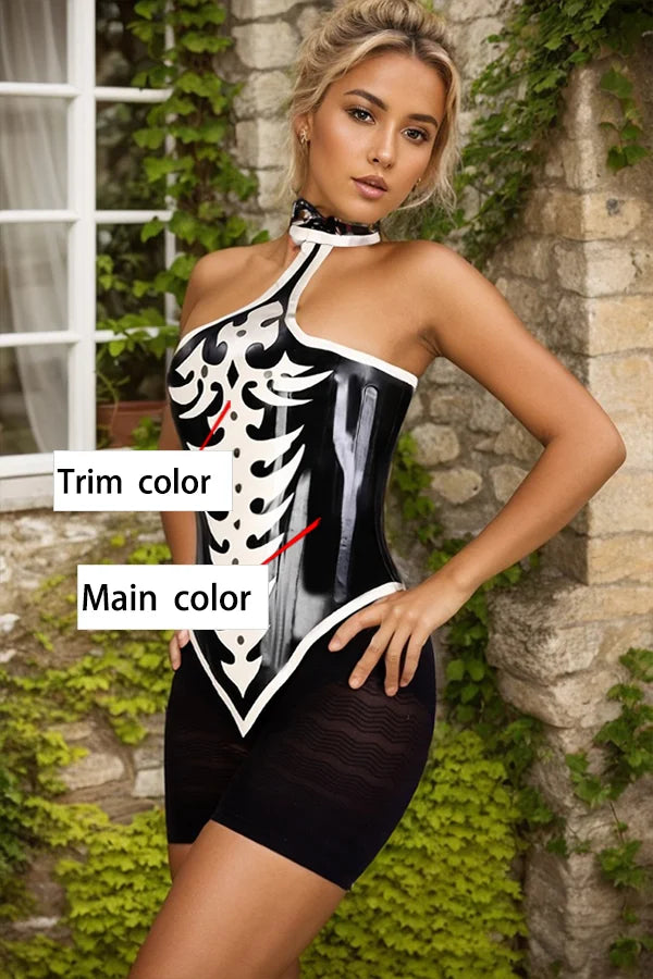 The "Tribal Sling Dance" Concept This corset is a masterpiece of modern high-contrast fashion. Crafted from luxurious high-gloss black latex, the 1.0mm thickness ensures a firm, supportive feel. The defining feature is the abstract white "skeleton" pattern, which offers a stylized interpretation of the human anatomy. The contrast between the deep black base and the artistic white overlays creates a dynamic visual energy that is both primal and futuristic.