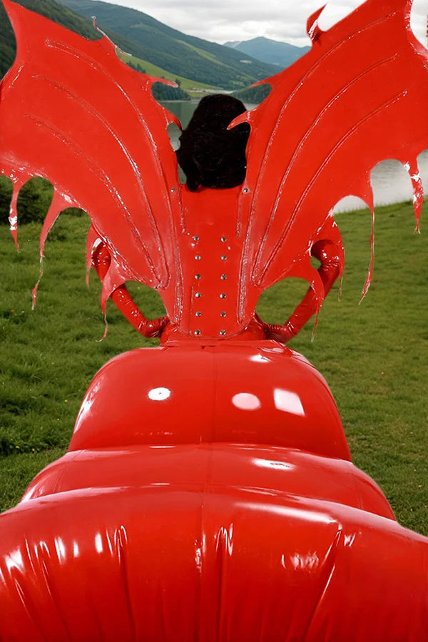 Merging Gothic fantasy with seductive power, this set presents a queen-like figure in latex¡ªfiery, commanding, and fearless. The vivid red hue, edgy corset, and imposing wing silhouette evoke the image of a noble "Queen Bee" or a dark sorceress, ideal for themed performances or dominant roleplay.