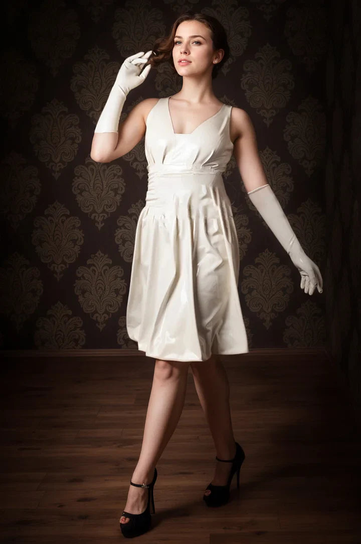 This refined dress is crafted from 0.40 mm natural latex, offering a soft, skin-tight fit with an alluring high-gloss finish.