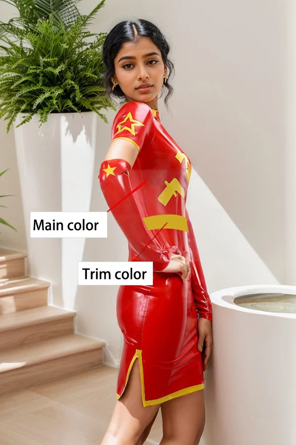 Material & Thickness: This dress, named "The Revolution," is crafted from 0.40 mm thick natural latex. It flawlessly merges the classic elegance of the Oriental Cheongsam (Qipao) with audacious revolutionary symbolism, creating a stunning and unforgettable statement piece.