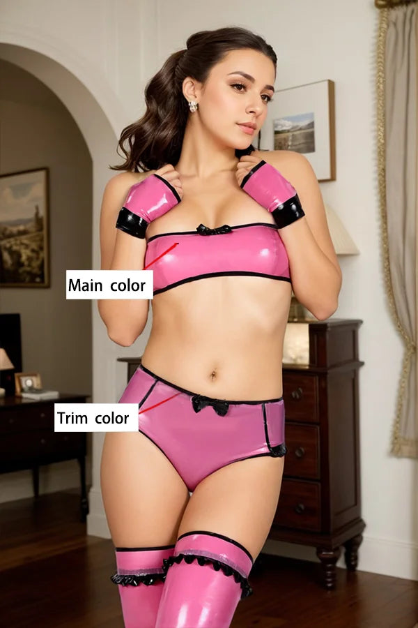 Mixed-Media "Tulle-Effect" Briefs: The low-rise panties are a masterpiece of layering. While the frame is constructed from solid pink latex, the central panels incorporate a semi-translucent pink material. This creates a soft, misty "tulle" visual that contrasts beautifully against the solid high-gloss edges.