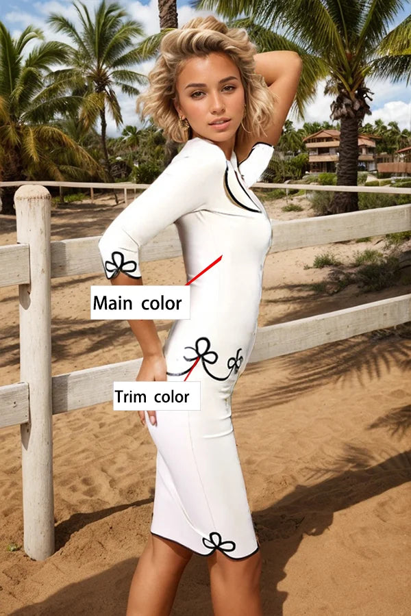 This slim-fit, knee-length set is a masterpiece of contrast and detail, featuring a tailored upper top and a matching pencil-style skirt.