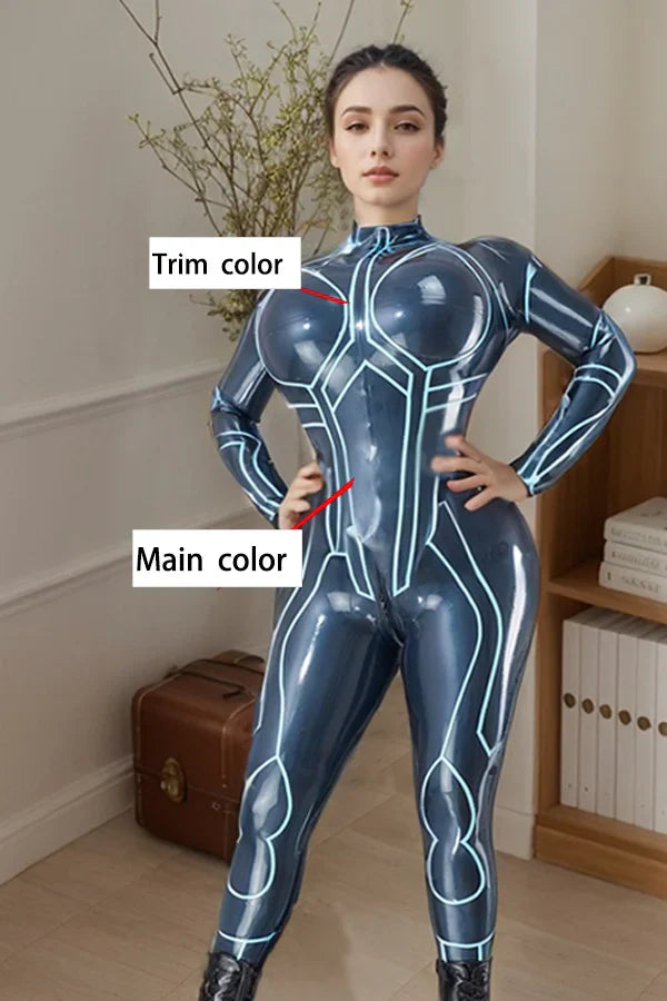 Engineered with elite tailoring, this catsuit acts as a high-compression "second skin." The natural elasticity of the metallic latex works in harmony with the graphic piping to visually sculpt the torso and elongate the limbs. The result is a commanding, aerodynamic profile that celebrates the wearer?¡¥s curves with absolute precision.