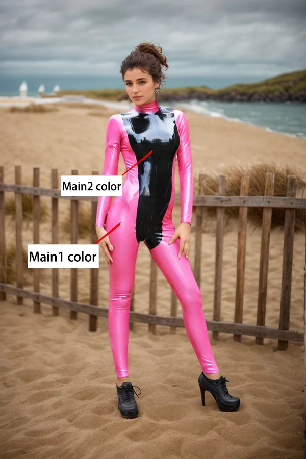Material & Gloss: Ignite your wardrobe with a surge of high-octane color. Crafted from premium 0.40 mm natural latex, the "Magenta Fusion" catsuit features a brilliant Rose Pink base paired with a deep, light-absorbing Black. Both colors are polished to a professional mirror-shine finish, delivering that iconic "wet-look" luster that amplifies the suit?¡¥s bold contrasts and luxurious texture.