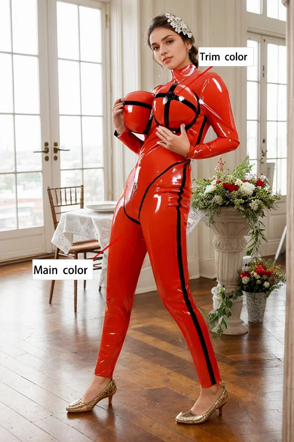 Material & Gloss: Ignite your presence with the "Missile Queen" catsuit. Expertly crafted from premium 0.40 mm natural latex, this garment features a brilliant, high-intensity red that demands attention. The ultra-smooth, reflective surface creates a dramatic "wet-look" shine, providing a high-gloss finish that perfectly emphasizes the bold architectural design and sharp color contrasts.