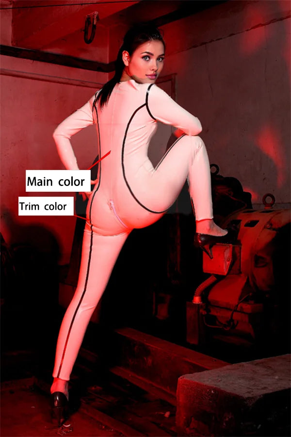 One-piece V-neck long-sleeved latex catsuit.